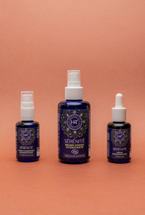 Ce rituel associe trois soins complémentaires : la brume visage hydratante, le sérum nourrissant et le spray d’ambiance réconfortant. Leurs formules, à base d’eaux florales, d’huiles végétales et d’huiles essentielles, aident à nourrir la peau sèche et délicate tout en calmant l’agitation intérieure.